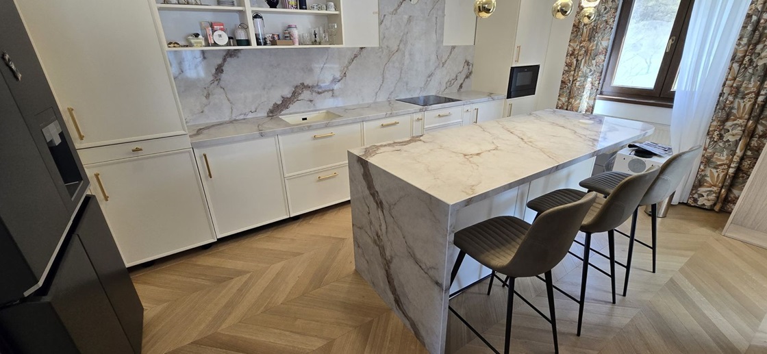 Blat Cuart Calacatta Pe Comanda Model Chery Lastra de 2 cm. Ideal pentru blat de bucatarie, contrablat si insula. Suntem Furnizori și Montatori de Blaturi din Compozit Quartz în toata Romania.